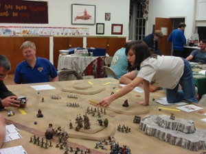 Starting in 2011, the HAWKs established the “Armies for Kids” program, in which the club gathers donated armies and terrain; prepares, paints, and bases everything, and then runs a special kids game at every Historicon where each attending child is presented with 2 painted and based opposing armies, a box of terrain, and a bag of other game aids, like rules, rulers, and dice.