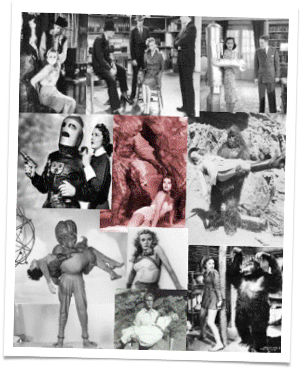 RIGHT: a collage of movie serial and b-budget movie stills featuring damsels in distress.