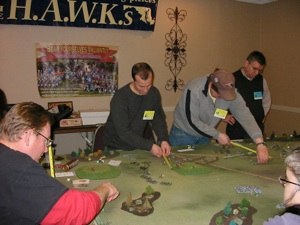 Chris Palmer ran this “debut” of Bear Yourselves Valiantly: Look, Sarge, No Charts: Fantasy, Ancients, and Mediaeval at Cold Wars 2013 in Lancaster, Pennsylvania. The scenario involved the forces of evil (skeletons, goblins, wargs, trolls, and other baddies) attempting to invade the elvish kingdom. Figures were a mix of repurposed Games Workshop Warmaster figures, Pendraken, and others. The players really enjoyed the rules and the game!