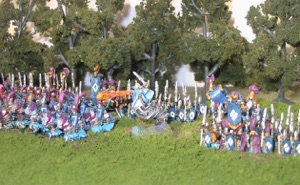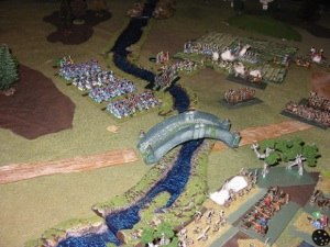 The high elf cavalry advances toward the bridge to fall on the rear of the forces of evil. This is a view from behind the evil lines. Note the Eureka Miniatures tree trolls at the right of the picture. These are really nice models.