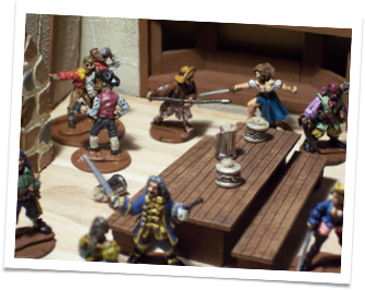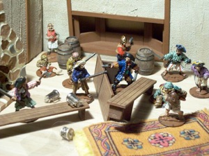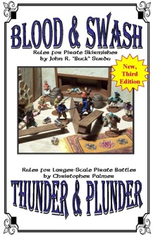 This booklet includes two complete sets of rules. Blood and Swash, written by me, is a set of rules for small pirate barroom brawls. Thunder and Plunder, written by Chris Palmer, is a set of rules for larger pirate actions involving "units" of ten or so pirates.