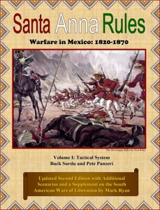 SAR(T) (a.k.a. SAR vol. 1) is my tactical System for larger battles. Volume 1 contains orders of battle and background information on the Mexican-American War and the Maximillian Adventure. In addition, this volume includes scenarios for Buena Vista, Churubusco, Puebla, and San Jacinto. Volume 1 includes several special mechanics to bring out the peculiarityes of this locality and era. It is designed to accurately portray the fell of battle in the "Santa Anna era" with each player controlling a brigade. While warfare of this period is Napoleonic-like, the Mexican-American War and the War of Texas Independence are neither Napoleonic wars nor like the American Civil War. Santa Anna Tactical Rules captures these unique aspects.