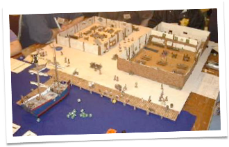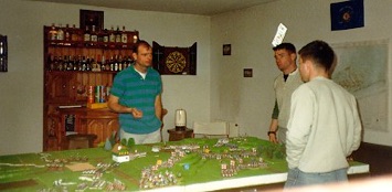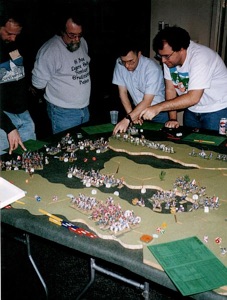 This picture is unique in that it shows a bunch of us in coats and ties playing a Blood and Swash game. We had all returned from the Friday night banquet of PointCon in April 2002. Pictured are Sara Adams (El Presidente for Life of the Harford Area Weekly Kriegspielers), Duncan Adams, Rob Dean, Geoff Graff, Alan Kaplan, me, Joey DiCamillo, Joe DiCamillo (whose face you can barely see), and the back of Norbert Brunhuber.