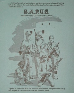 Beer and Pretzels Urban Combat (BAPUC) was my first attempt to publish a wargame. BAPUC was a skirmish game set in urban environments. The board, while designed myself, looked very much like the SPI game, Sniper. It used a card-based turn sequence. BAPUC was quite fun. The game was written while I was in high school, but it was published while I was a cadet. I can recall hearing people shouting during BAPUC games at the other end of the hallway.