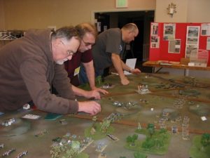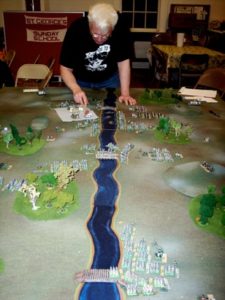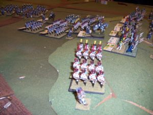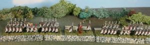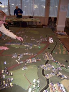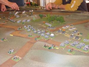 In Fate of Battle, infantry battalions and cavalry battle groups are represented by a pair of bases, so that columns, lines, and squares can be easily depicted on the table. Green dice used for activation are placed near the brigade, division, and corps commanders. There are no large pink rectangles (chart cards) to spoil the aesthetics. (The rectangle you see in the picture on the left is a notebook someone was using to plan his next game.) To play the game you need to make some special dice from wooden cubes or blank dice. The bases have small labels on the backs of them with information on them. With the labels and the special dice, you have all the information you need to play the game, right where you need it. The systems are elegant and smooth. For the Napoleonic version of LSNC we’ve added formations (column, line, and square) so that you get that paper-scissors-rock feel. We’ve also added a skirmish phase at the beginning of each turn. This provides an elegant mechanism to reflect the effect of skirmishers without gunking up the game.
